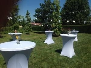 Locations tables mange-debout avec housses noires et blanches.Hauteur de 1m10 avec plateau 80 cm de diamètre.